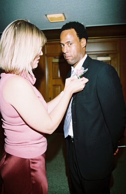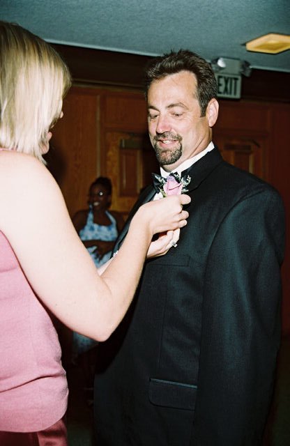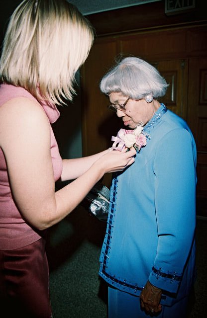Yvonne's Grandmother, Mrs. Bernice Smith having a corsage put on by Yvonne's sister in-law, Julia.