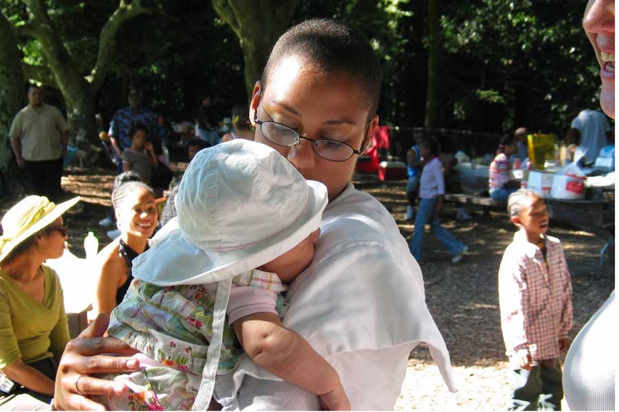 Christine holding Michael and Julia's newborn, Mia